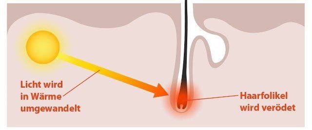 Hierbei wird Licht über das Melanin im Härchen selbst geleitet und schließlich im Haarfolikel absorbiert. Es kommt zur Umwandlung der Lichtenergie in Wärme, die Haarwurzel wird verödet. Nach einigen Tagen fallen diese Haarwurzel ab.
